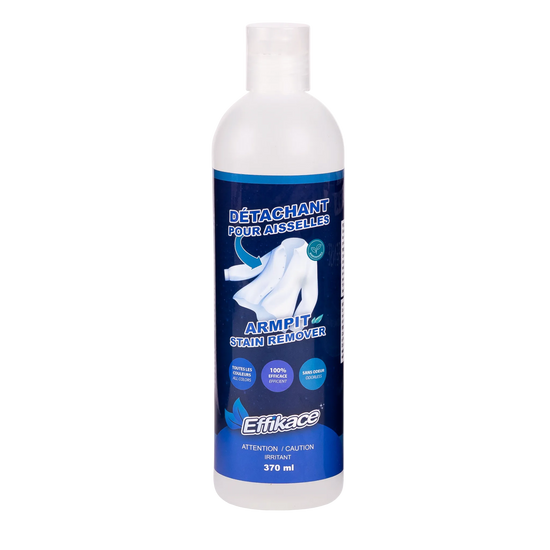 Redonnez vie à vos vêtements grâce au détachant pour aisselles Effikace! Spécialement conçu pour éliminer facilement les taches jaunâtres et les résidus tenaces laissés par les antisudorifiques sous les bras, Effikace agit là où les lavages ordinaires échouent. Sa formule puissante cible les accumulations incrustées, ravive la blancheur et préserve l’éclat des tissus, sans les abîmer. Fini les auréoles disgracieuses : vos chemises, t-shirts et vêtements préférés retrouvent leur apparence d’origine, lavage après lavage. Format de 370 ml pour traiter de nombreux vêtements. Offrez à votre garde-robe une seconde jeunesse avec Effikace, l’allié incontournable contre les taches d’aisselles!