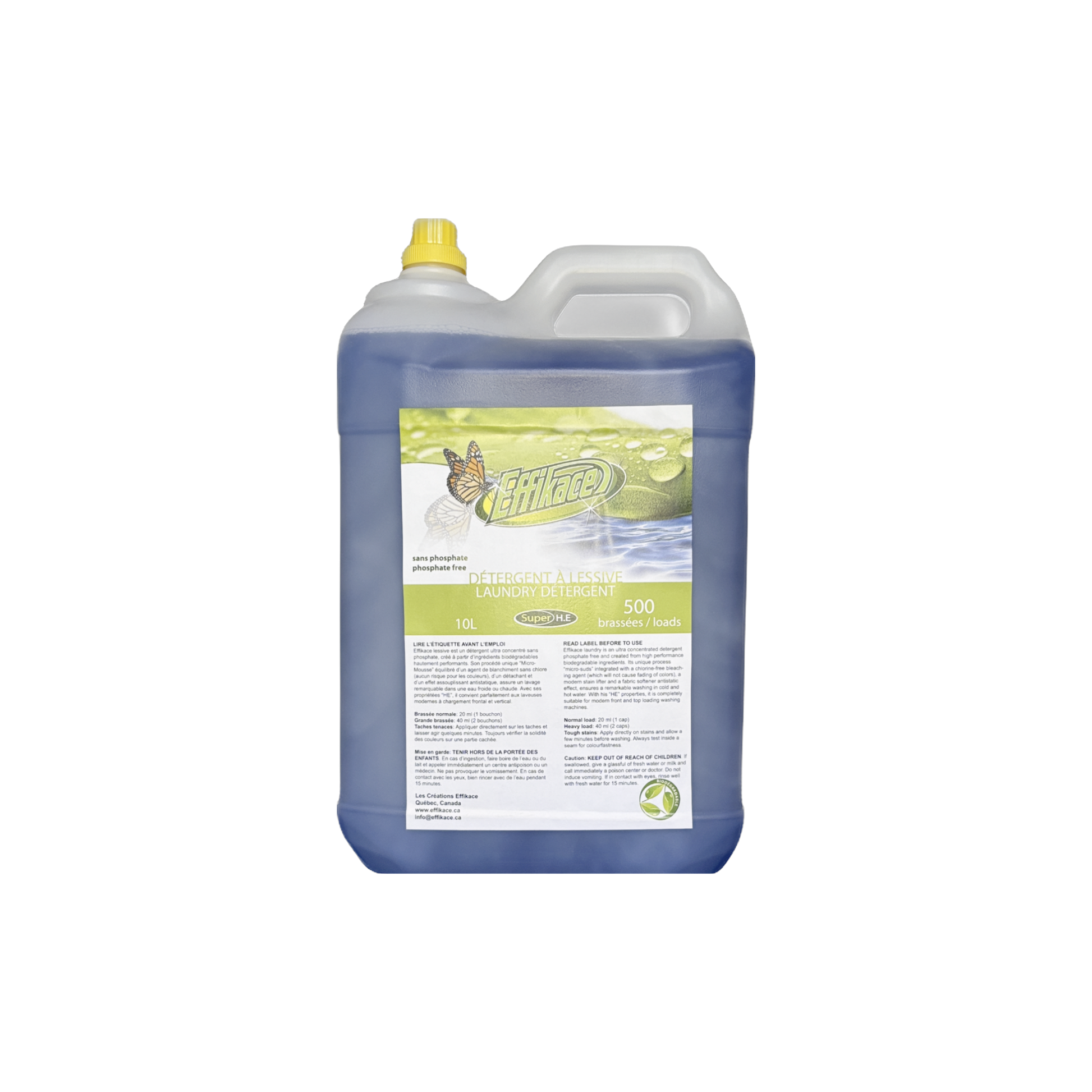 La quantité de détergent EFFIKACE LESSIVE nécessaire pour lessiver efficacement une brassée normale est de 20ml seulement ce qui en fait un détergent à la fois écologique et économique. Vous apprécierez également son contenant pratique et écologique plus petit que celui des marques populaires – qui permet d’effectuer un nombre plus élevé de brassées, soit 50 par litre. Fait non négligeable, ce contenant compact permet aussi de réduire le matériel d’emballage et d’optimiser son transport contribuant ainsi à réduire l’émission des gaz à effet de serre.